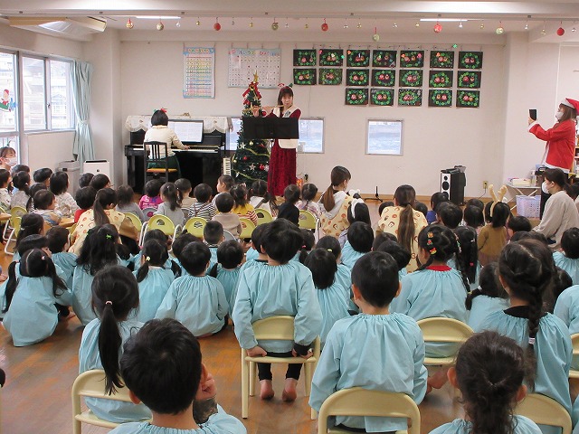 クリスマスコンサートをしました! リトミックの先生方が演奏される、フルートやピアノの音色ににうっとり・・・♡ クリスマスソングに合わせ、トライアングルやタンバリン、鈴、マラカスの演奏も楽しみました^^ |